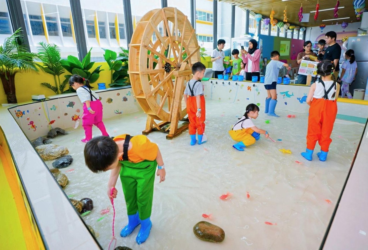 Elements: Interactive pool, fishing nets, a variety of colorful fish.